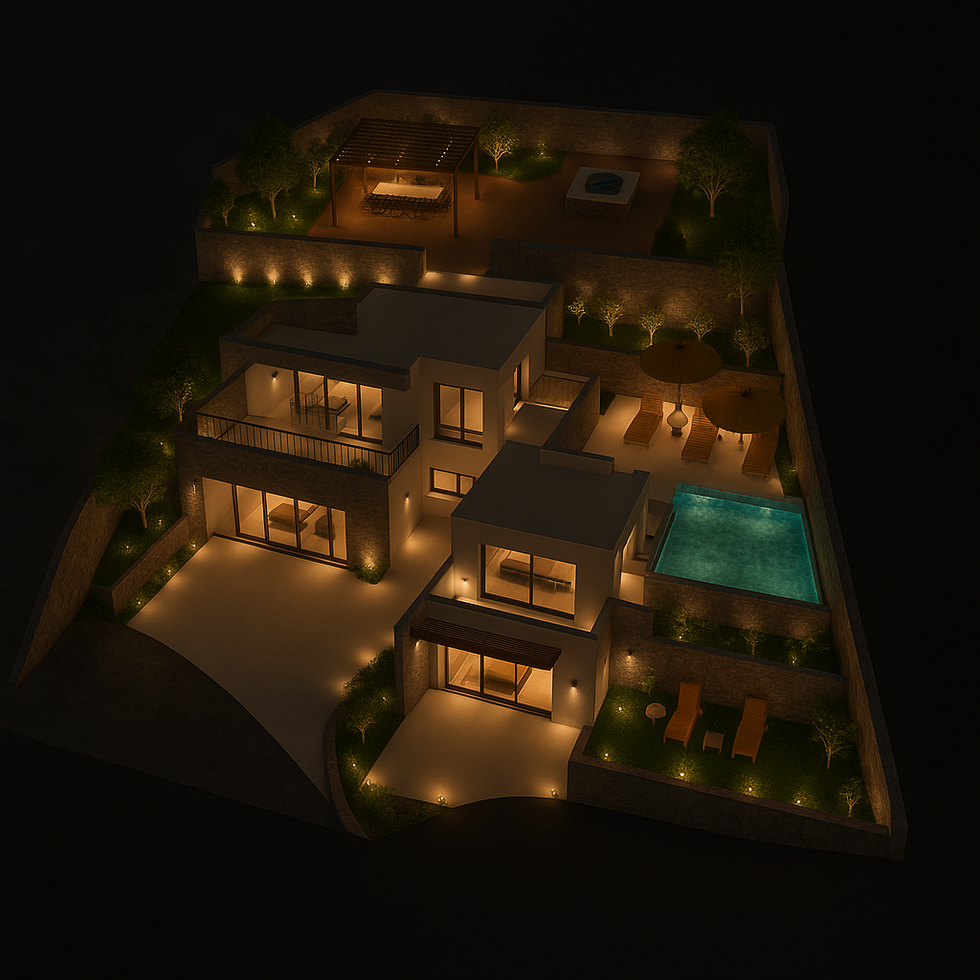 A private access path connects the villas to the beach, and the exterior lighting was designed with a soft, cohesive aesthetic that complements the overall look without disturbing the natural landscape.